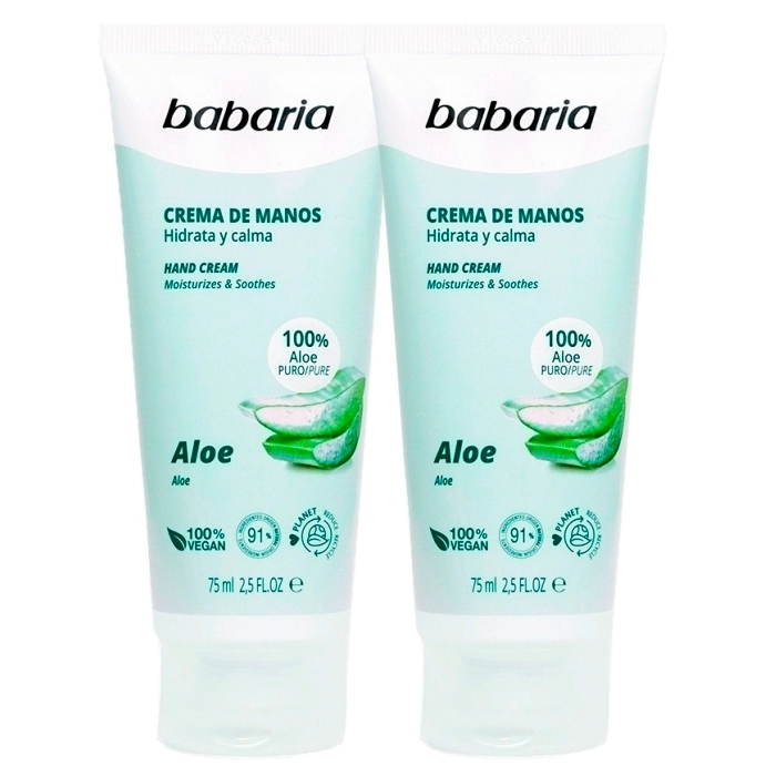 Babaria Aloe Vera Vegan Hand Cream 75ml x2 (Pack) Aloe Vera has restorative properties, allowing for improved skin. Specially formulated for cracked and dry hands from daily work. Glycerin is a product that retains skin moisture, keeping it smooth and soft.