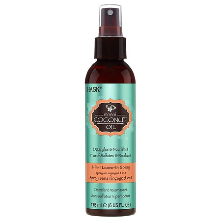 Hask Monoi Coconut Oil 5-in-1 leave-in spray with coconut oil helps soften, detangle and moisturise dry strands.